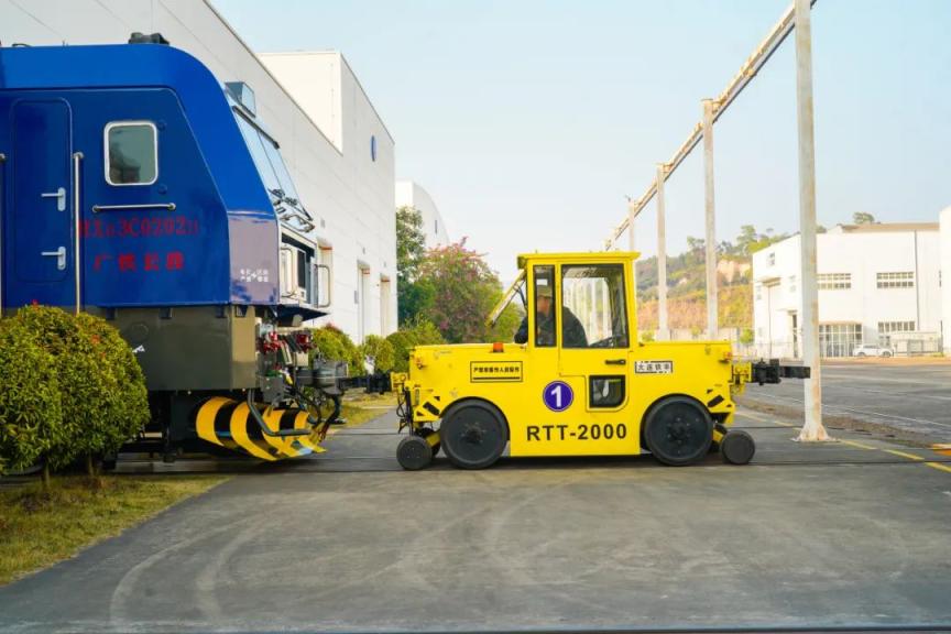 由于待修的机车为无动力状态,被横移到指定位置后,上下移车平台就需要使用公铁两用车来移动。